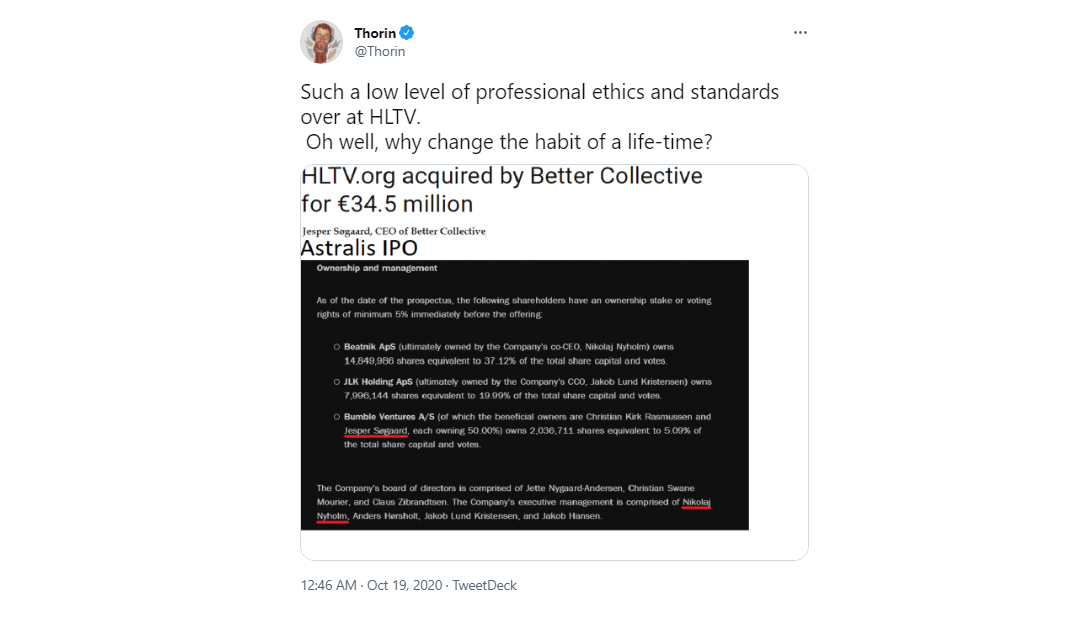 The tale continues with another chapter of conflict of interest, this time it includes the journalistic integrity of HLTV, professional ethics and Jesper Søgaard, who has an ownership interest in Astralis. Better Collective bought ownership of HLTV in February of 2020 (Better Collective acquires leading esports platform) . The CEO Jesper Søgaard also has an ownership interest in Better Collective, which leads to a serious conflict of interest as outlined in the first report by Thorin.